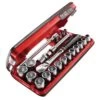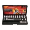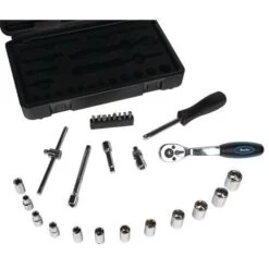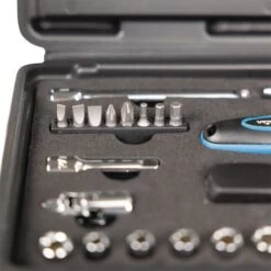 Plastic case comprising 26 x 1/4″ pieces: 1/4″ sockets Ø 5 to 14 mm 1 x 1/4″ universal joint 2 x 1/4″ extension bars 1 ratchet Bits – 1 extension handle 1 bit holder socket