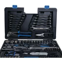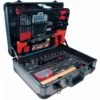 Plastic case containing 101 tools: – 1 multi-grip pliers 1 x universal cutter 1 x crimping pliers 9 Allen keys 13 x combination wrenches: Ø 6, 7, 8, 10, 11, 12, 13, 14, 15, 16, 17, 18, 19 mm 18 x 1/2″ hex sockets: Ø 8, 9, 10, 11, 12, 13, 14, 15, 16, 17, 18, 19, 20, 22, 24, 27, 30, 32 mm 1 x 1/2″ universal joint 1 x 1/2″ ratchet: 72 teeth with push system 2 x 1/2″ extension bars: 125 mm and 250 mm 1 bit holder socket 15 x screwdriver bits: TX: 40, 45, 50, 55, 60 mm/PZ: 3, 4 mm/PH: 3, 4 mm/FD: 8, 10, 12 mm/H: 7, 8, 10, 12, 14 mm 13 x 1/4″ hex sockets: Ø 4, 4.5, 5, 5.5, 6, 7, 8, 9, 10, 11, 12, 13, 14 mm 1 x 1/4″ sliding handle 1 x 1/4″ extension handle 1 x 1/4” flexible extension bar 1 x 1/4″ universal joint 1 x 1/4″ ratchet: 72 teeth with push system 2 x 1/4″ extension bars: 50 mm and 100 mm 17 x bit holder sockets: TX: 8, 10, 15, 20, 25 and 30 mm/PZ: 1, 2 mm/PH: 1, 2 mm/FD: 4, 5.5, 7 mm/H: 3, 4, 5, 6 mm