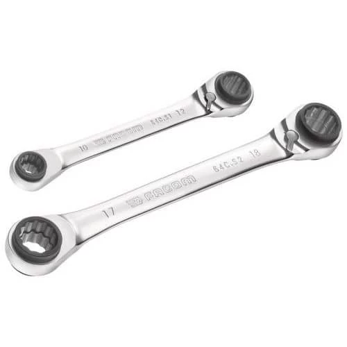 - Set of 2 multi-opening right-handed ratchet ring spanners.