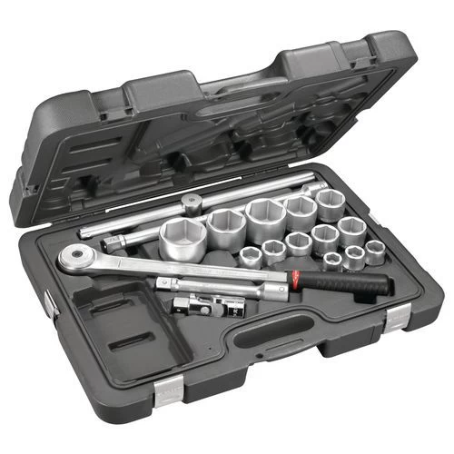 Contains: 1 x 3/4″ 72-teeth ratchet, 13 x 3/4″ hex sockets: 19 – 21 – 22 – 24 – 27 – 30 – 32 – 34 – 36 – 41 – 46 – 50 – 55 mm, 2 x 3/4″ extensions: 200 and 400 mm, 1 3/4″ joint