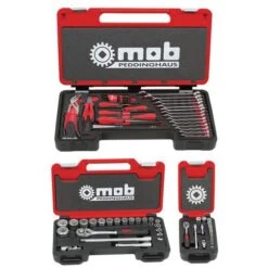 Contents: – 1 x 1/4″ pear-head ratchet – 12 x 1/4″ sockets: 4 – 5 – 5.5 – 6 – 7 – 8 – 9 – 10 – 11 – 12 – 13 – 14 mm – 1 x 1/2″ pear-head ratchet – 17 x 1/2″ sockets: 8 – 10 – 11 – 12 – 13 – 14 – 15 – 16 – 17 – 18 – 19 – 21 – 22 – 24 – 27 – 30 – 32 mm – 2 universal joints: 1/4″ and 1/2″ – 2 extensions: 1/4″ and 1/2″ – 14 combination spanners: 7 – 8 – 10 – 11 – 12 – 13 – 14 – 15 – 16 – 17 – 18 – 19 – 22 – 24 mm – 3 mechanic’s slot screwdrivers: 3.5 x 75 – 5.5 x 125 mm – 6.5 x 150 mm – 1 Phillips screwdriver: PH1 – PH2 – 1 case of 9 L-keys: 1.5 – 2 – 2.5 – 3 – 4 – 5 – 6 – 8 – 10 mm – 1 x 160-mm universal pliers – 1 multi-grip tapered nose pliers 240 mm – 1 mechanic’s riveting hammer 30 mm