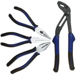 - Set of 4 pairs of pliers: universal pliers 160 mm, cutting pliers with half-round nose 160 mm, long-nose pliers 160 mm, multi-grip pliers 250 mm.