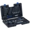 Contains: 9 mixed keys: 8 – 10 – 11 – 12 – 13 – 14 – 17 – 19 – 23 mm, 1 wrench 8”, 9 hex keys: 1.5 – 2 – 2.5 – 3 – 4 – 5 – 6 – 8 – 10 mm, 2 slot screwdrivers: 5 x 75 – 6 x 100, 2 Phillips PH screwdrivers: no. 1 x 75 – no. 2 X 100, 1 tester screwdriver, 1 set of 6 precision screwdrivers, 1 diagonal cutting pliers 155 mm, 1 straight-nosed pliers with wire cutter 165 mm, 1 multi-grip pliers 240 mm, 1 universal pliers 180 mm, 1 Russian pincer 220 mm, 1 universal shear, 1 electrician’s hammer, 30 screw bits, 1 x 1/4” socket holder, 1 bit holder, 1 ratchet screwdriver for bits, 1 calliper, 1 flat chisel, 1 pointer, 2 pin drivers, 1 pointed chisel, 1 lug pliers, 1 set of 30 miscellaneous lugs, 1 metal cutter, 6 cutter blades, 1 diode torch (batteries not provided), 1 x 5-m metal tape measure, 1 metal saw, 1 spirit level, 1 soft file, 1/4” accessories: 13 sockets: 4 – 4,5 – 5 – 5,5 – 6 – 7 – 8 – 9 – 10 – 11 – 12 – 13 – 14 mm, 1 x 72-tooth ratchet, 1 sliding handle, 2 extensions 100 mm and 50